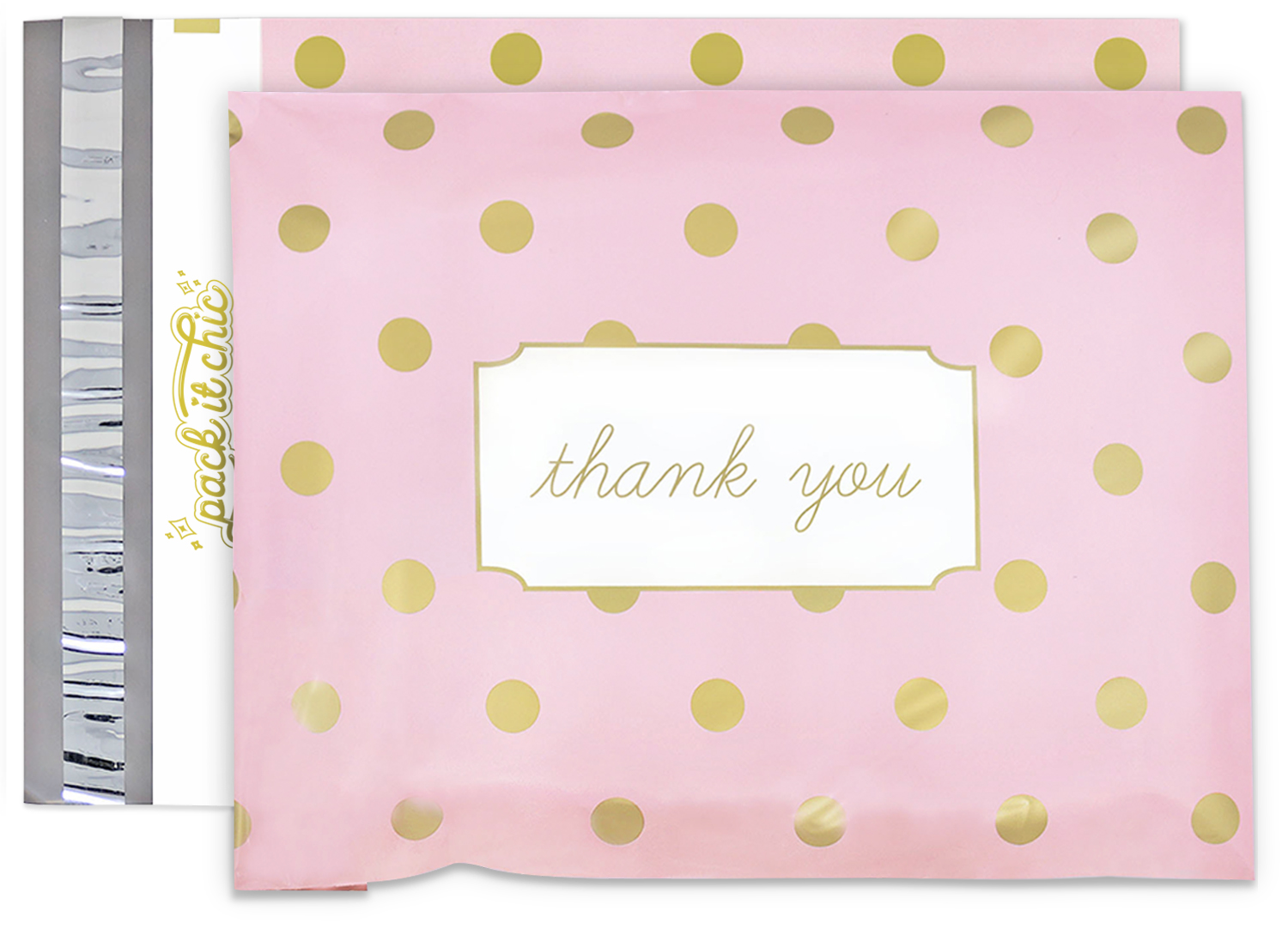 - Design: Pink Polka Dot - Thank You - 10” Width X 13” Length. 100 Units of the Custom Printed Poly Mailer Bags. Our printed mailing bags do NOT contain bubble cushioning.